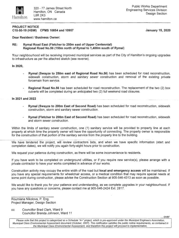 The long awaited widening of Rymal Road and Regional Road #56 will begin in 2020. Prior to the start of construction, we will be holding a Public Information Meeting some time in March to explain what you can expect.