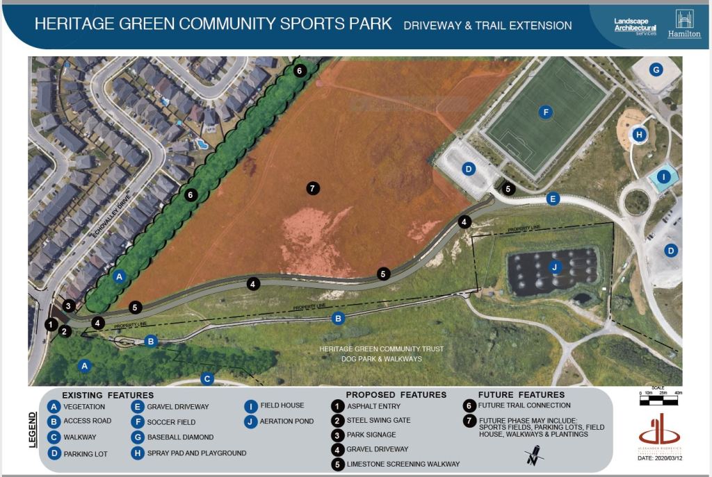 Heritage Green Community Sports Park is located at 355 First Road West in Ward 9. The 32.57 hectare (80.5 acre) master planned sports park includes a number of high-quality soccer fields and ball diamonds. Park amenities include: 2 baseball diamonds, 4 natural and 1 artificial turf soccer pitches, a playground, spray pad, field house, walking pathways, multiple gravel parking lots. The park is also located next to the Heritage Green Community Trust dog park and walkways.