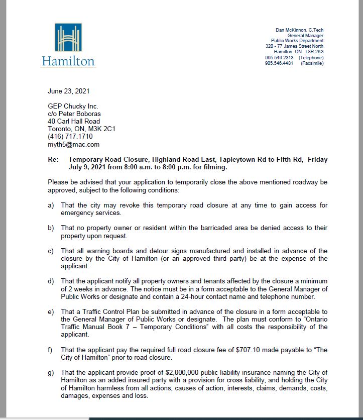 All residents and businesses will retain access to their properties. Movie production staff will be canvassing the impacted neighbours to ensure that they are aware of the filming and road closure.