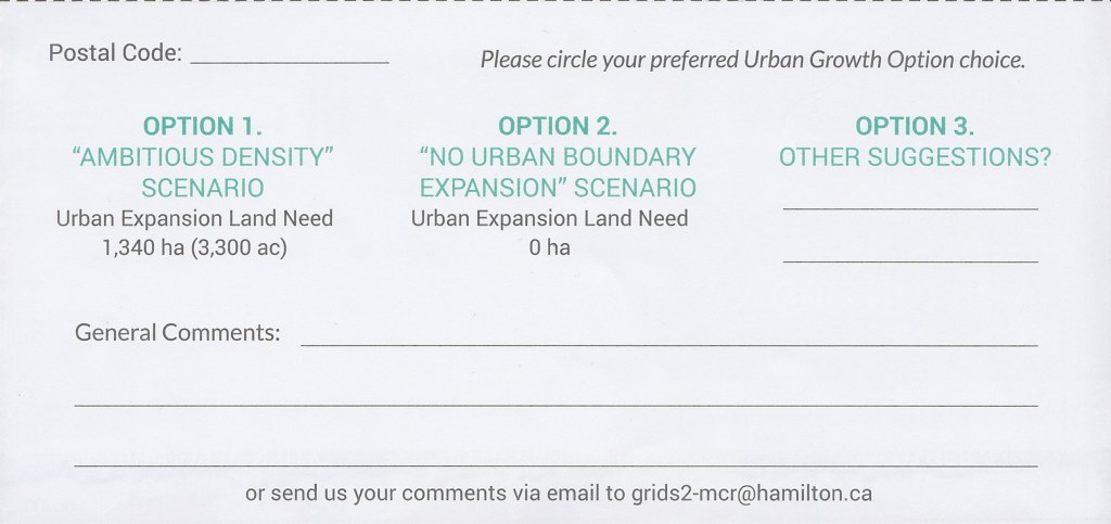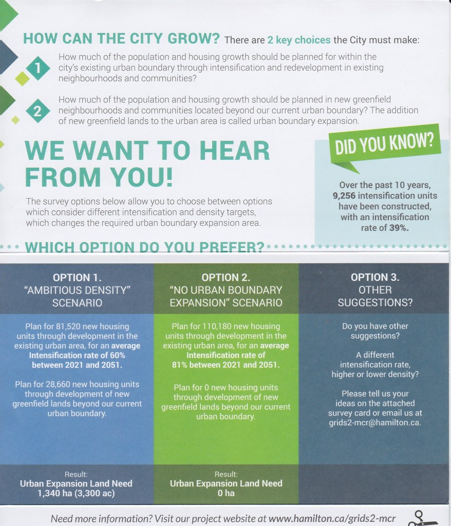 The surveys, as seen here, are being delivered this week to every household through Canada Post unaddressed admail. Residents can learn more about the issues at https://www.hamilton.ca/city-planning/official-plan-zoning-by-law/grids-2mcr-urban-growth-survey . Check your mailboxes.