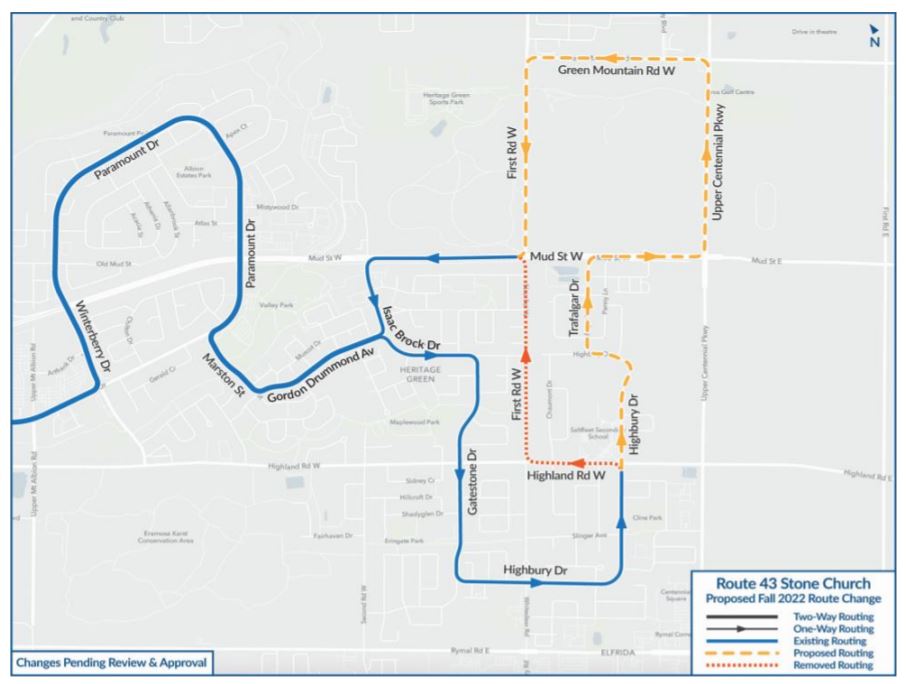 This proposed route change is designed to bring local transit access to the newer subdivisions of Penny Lanes Estates, Empire Victory (Nash Neighbourhood) and Heritage Green Sports Park. Frequency will also change from every 30mins to every 20 mins. This route change helps to improve connectivity, frequency and dependability.