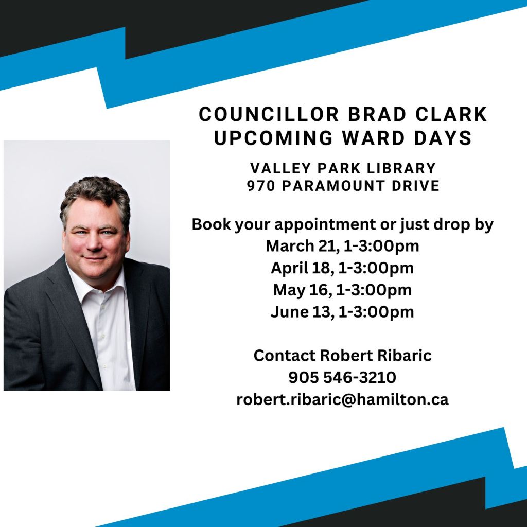 Councillor Brad Clark Ward Days Posted on March 2, 2023 by Councillor Brad Clark Share this: Click to share on X (Opens in new window) X Click to share on Facebook (Opens in new window) Facebook Like Loading...