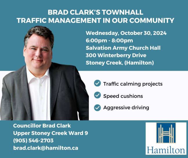 Brad Clark Townhall: Traffic in our Community Posted on October 1, 2024 by Councillor Brad Clark Share this: Share on X (Opens in new window) X Share on Facebook (Opens in new window) Facebook Like Loading...