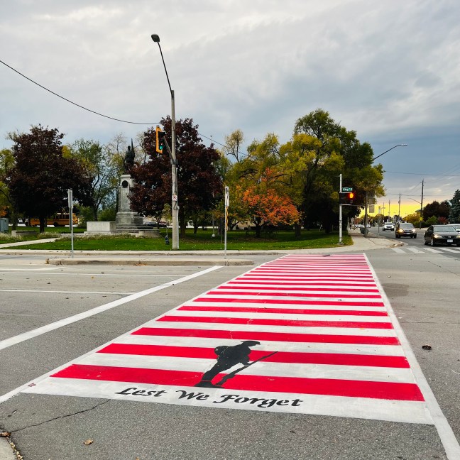 The three Stoney Creek Councillors Jeff Beattie, Matt Francis and Brad Clark worked together with our Public Works staff and City Council to place a unique Veterans Crosswalk at the cenotaph (funded through landfill royalties).