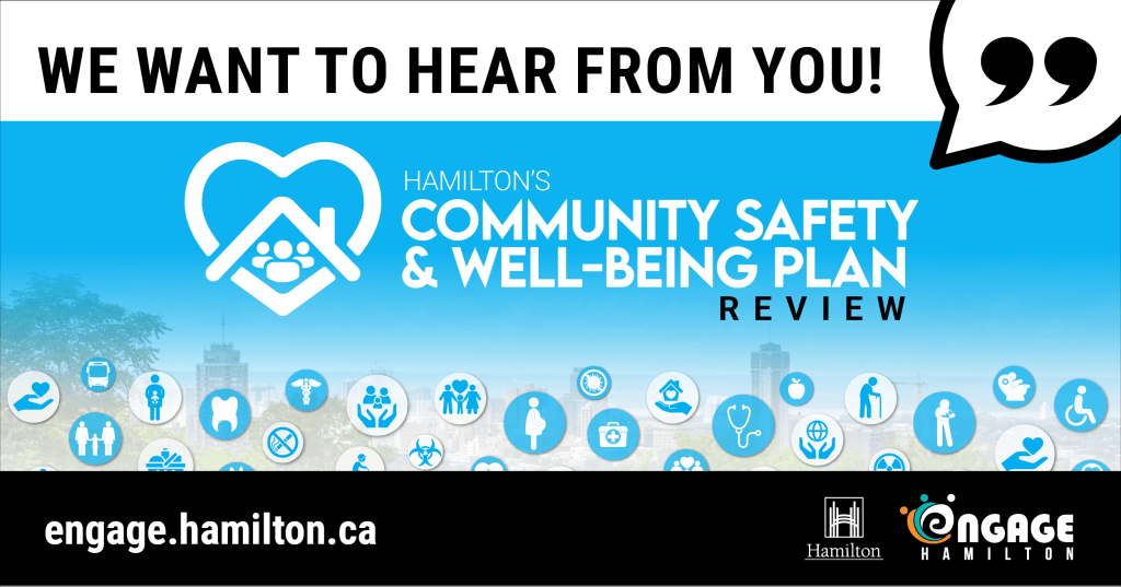 We want to hear from you! Share your feedback on Hamilton’s Community Safety and Well-Being Plan to ensure it reflects the community’s needs and priorities. The survey has been extended from December 1st to December 20th. Participate in our survey by following this link. engage.hamilton.ca/safetyandwellbeing.